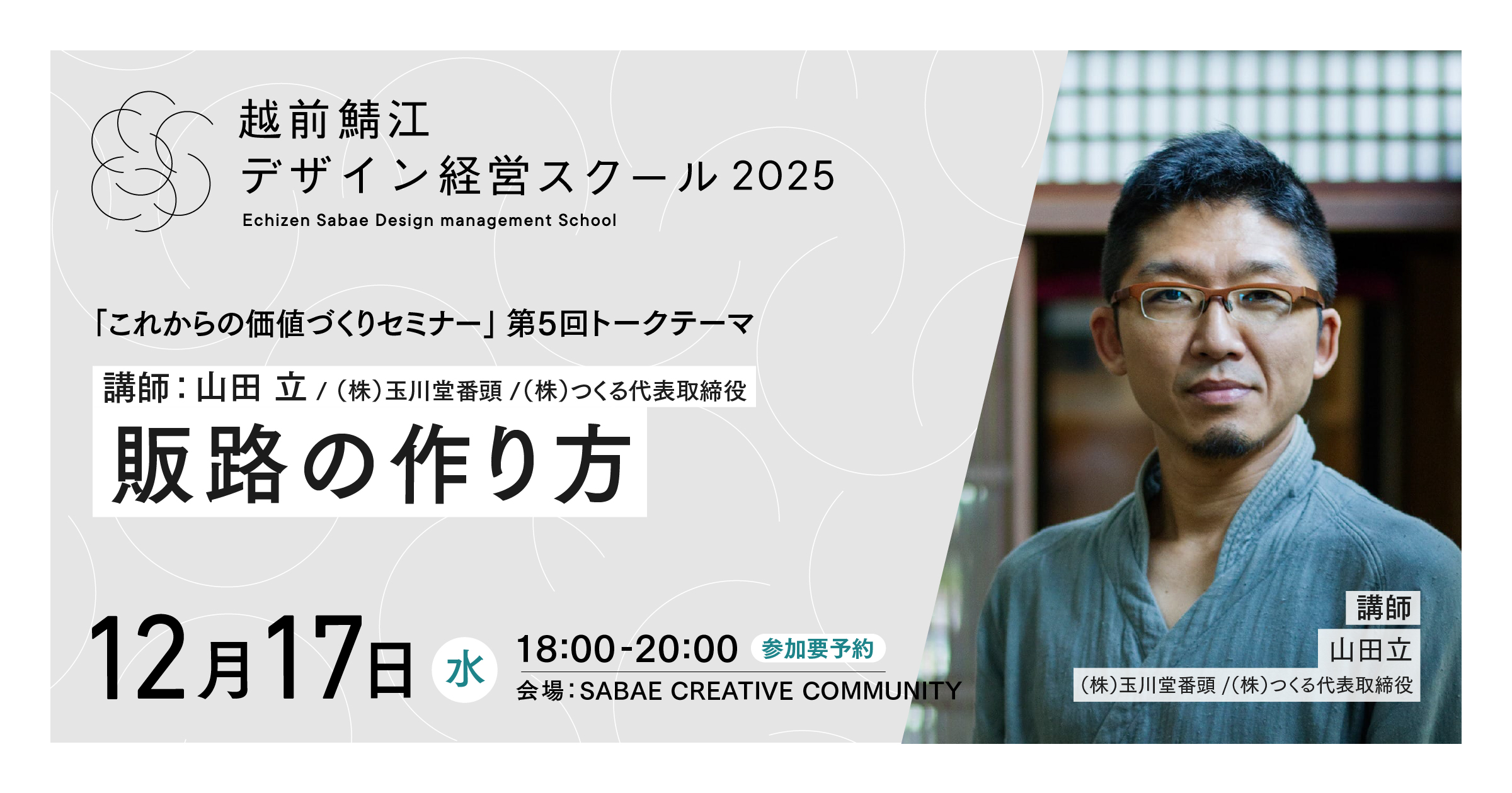新潟県の燕三条地域で、老舗鎚起銅器メーカーの営業・企画や、燕三条地域のクラフトツーリズム推進に取り組まれている山田立さんにお越しいただき、『販路の作り方』というテーマで講演いただきます。時代に合わせて変わり続けてきた燕三条のものづくりの奥深さを、地域内外の人々にどのように伝え、製品を手に取ってもらうのか。そのプロセスを、国内外での販路開拓のご経験を交えながらお話しいただきます。ぜひ会場にてご参加ください!